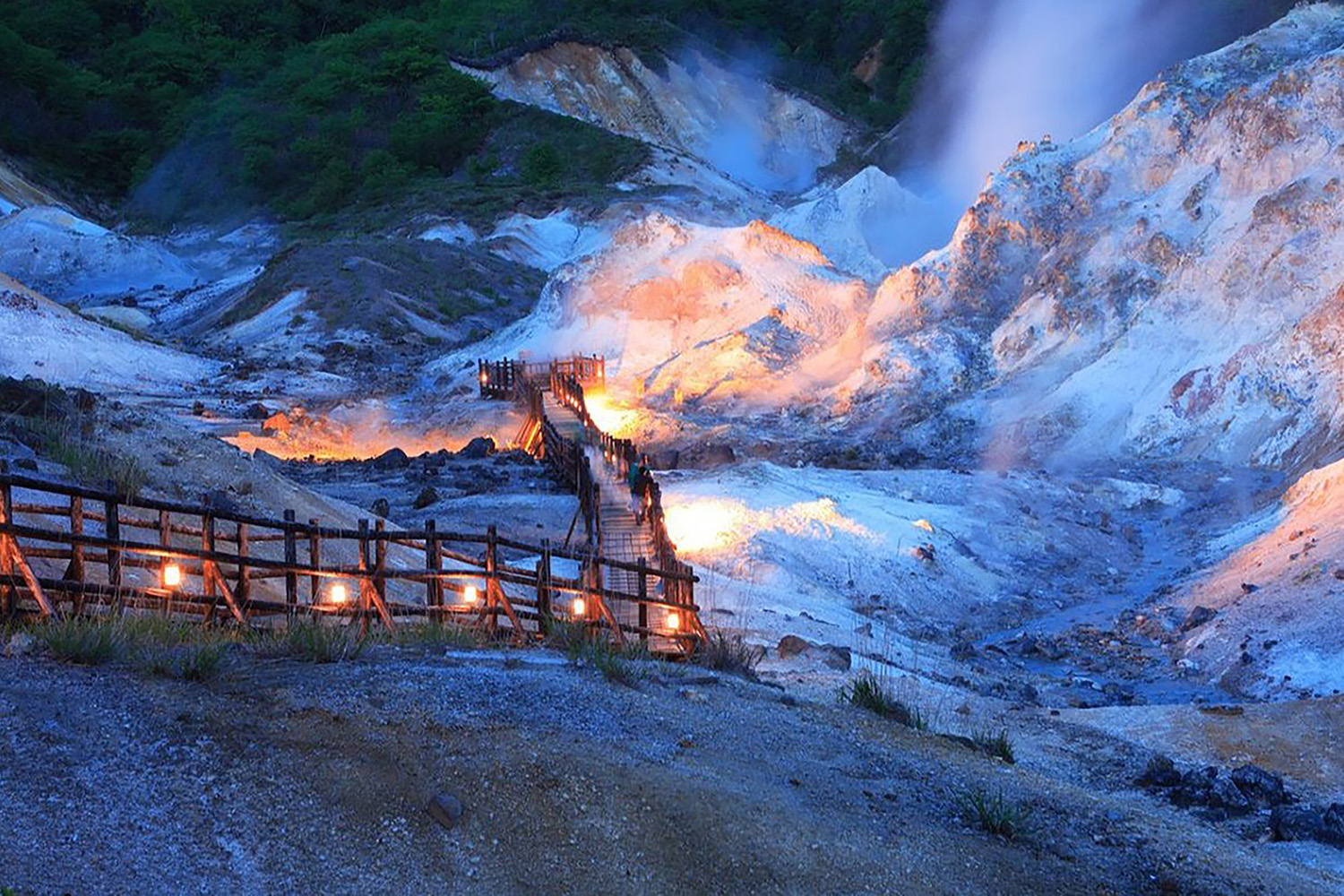 夜になると風景は一変。白い湯けむりが立ちのぼり、遊歩道に灯るあかりが幻想的な雰囲気に。