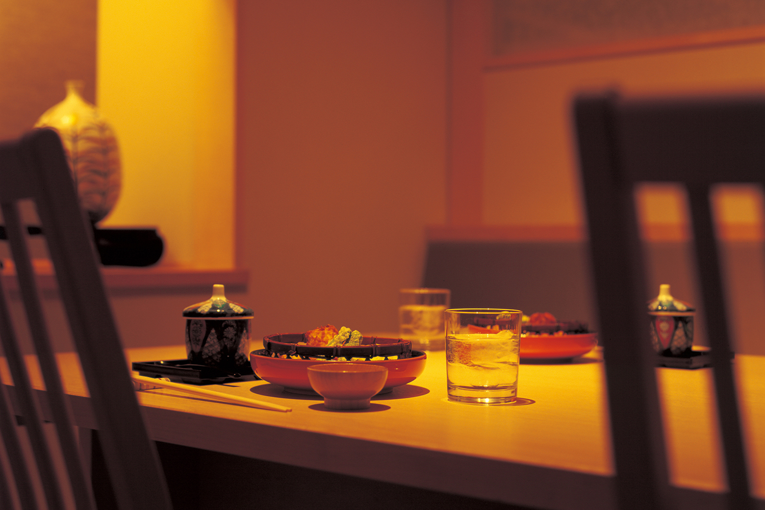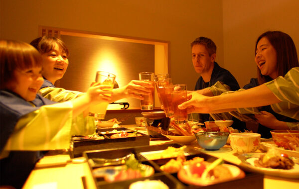 半個室の落ち着いたテーブル席にて、家族そろって食事を囲みながら、旅先での思い出を語り合うひとときを。