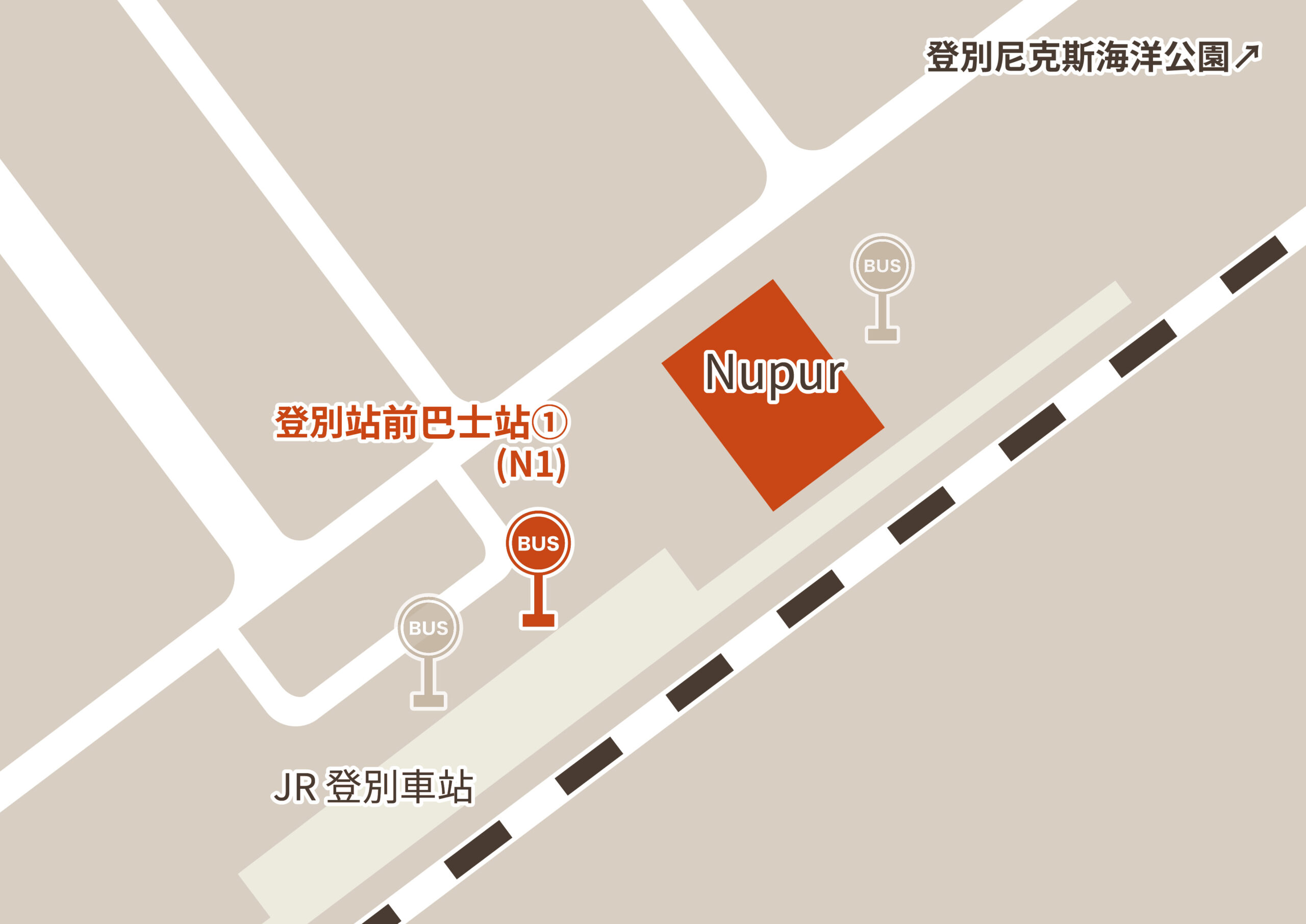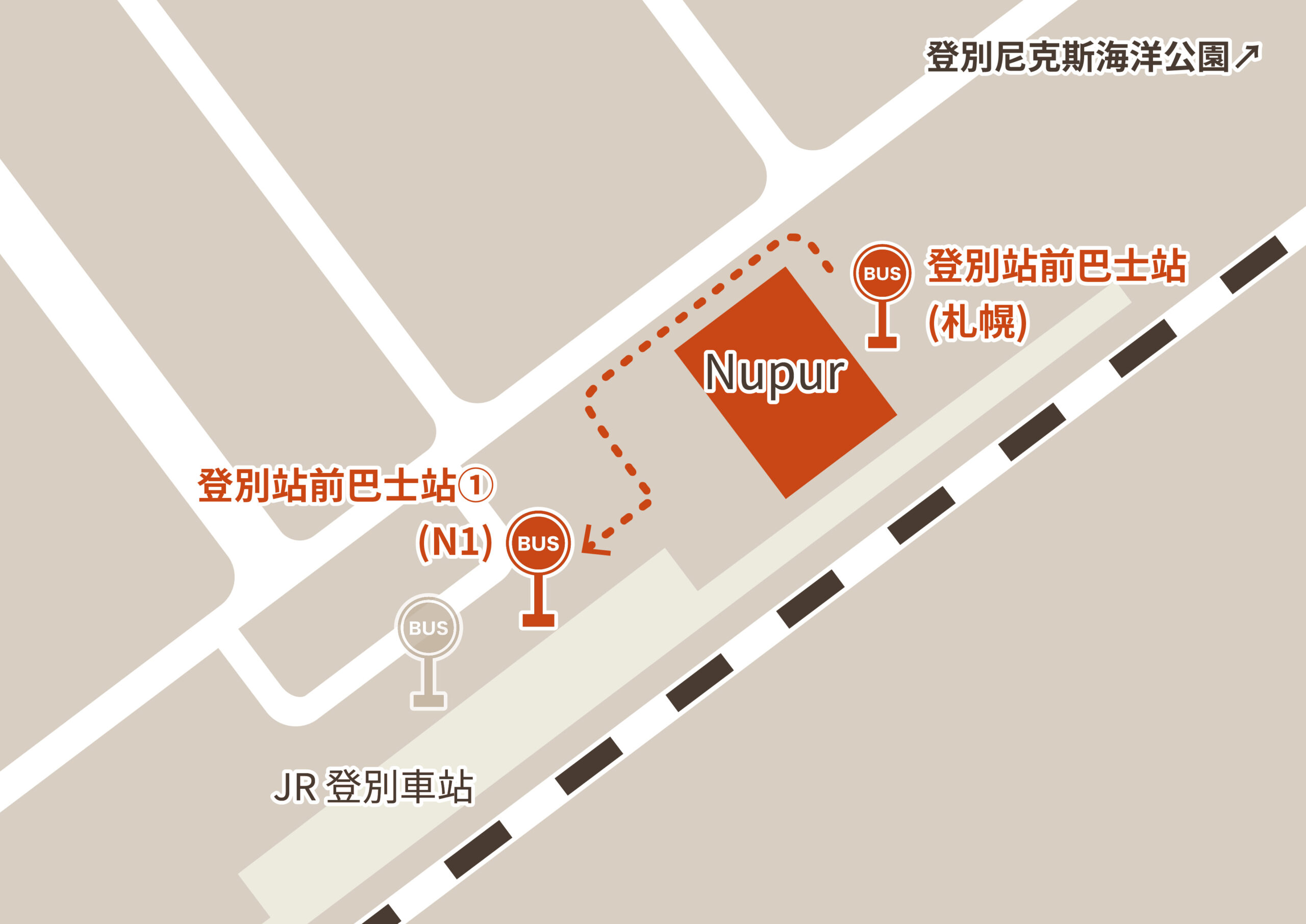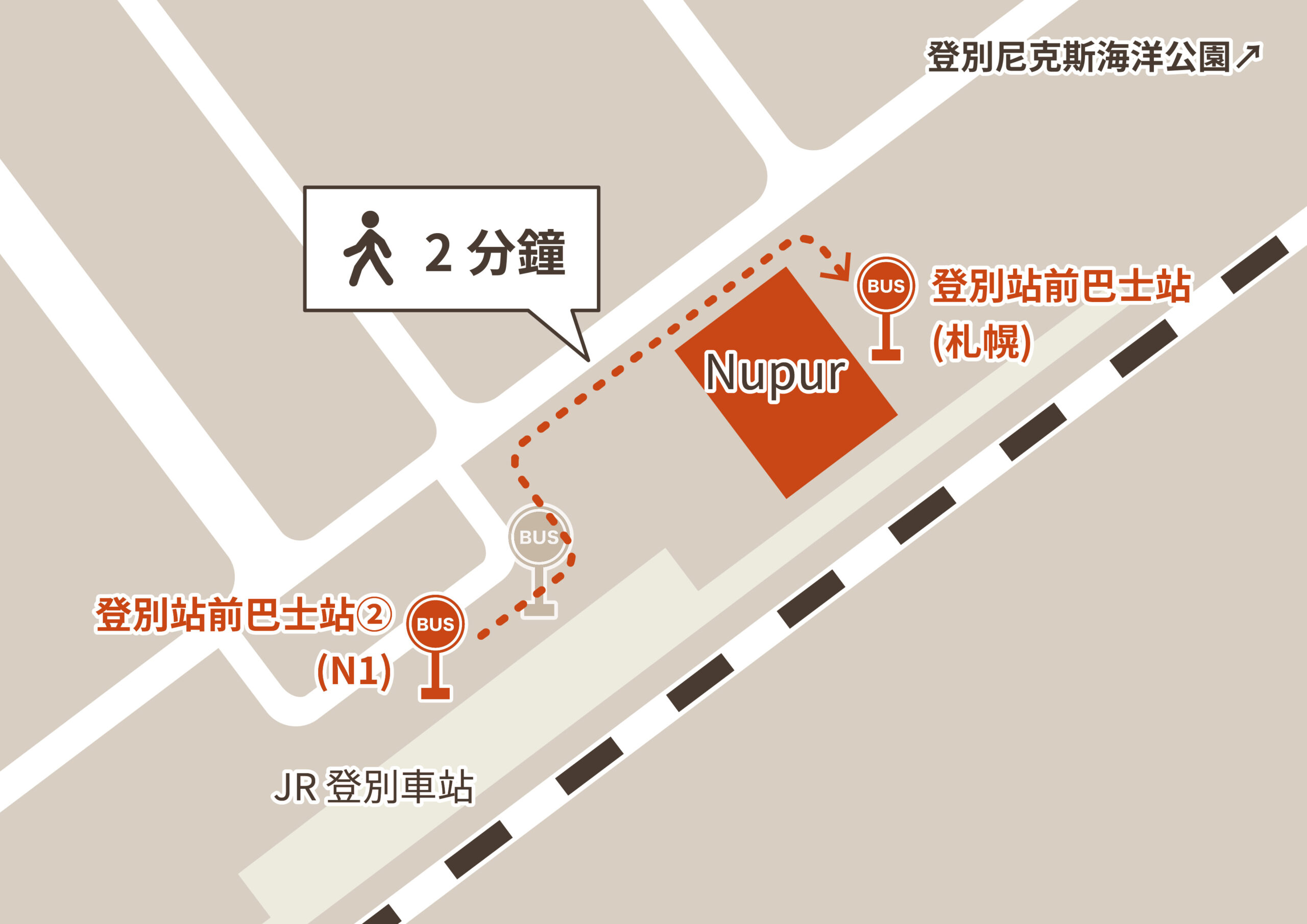 | 所需時間 | HAYABUSA號 →(巴士1小時) →「登別站前(飛機場)」巴士站 →(步行1分鐘) →「登別站前①」巴士站 →(巴士15分鐘) →「登別溫泉」巴士站 |