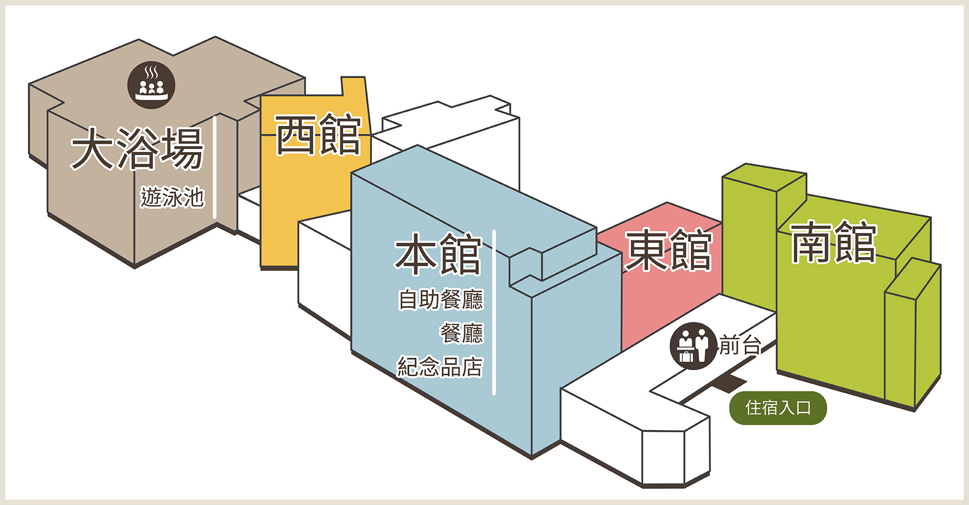 南館 “是靠近櫃台和正面入口的客房樓。去大浴場時可以在館內散步逛街。